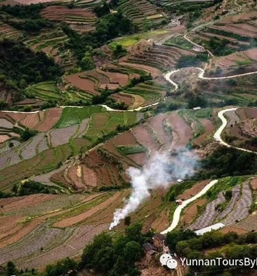 It's a big day! Start hiking from Baoshan and climb for about 4 hours through terrace fields, villages, and along a muddy or rocky path high above the Yangtze River. Cross through stone channels with a torch. Have a picnic lunch on the way. Then continue walking for nearly 3 hours on a flat or downhill track to a small village, home to only three families, and stay overnight in a local Naxi family house that has no Wi-Fi. Enjoy the peace and quiet with only the stars overhead. Sleep in dorm beds with shared showers and a country toilet. Walk through small villages, meeting cows along the way, and pass magnificent terrace fields.